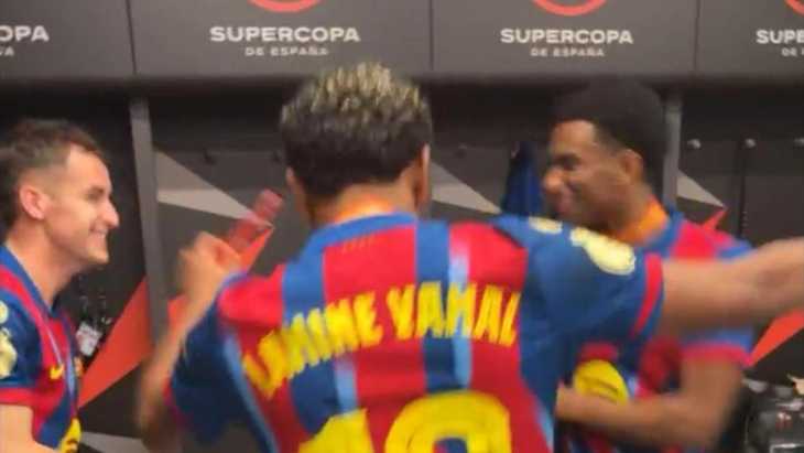 El primer trofeo de la temporada del Barça, el cuarto de la era Flick, y de nuevo con el Real Madrid como rival en la final, tuvo una celebración por todo lo alto. Tras los festejos sobre el césped, y con el presidente Laporta animándose a alzar el título después de que lo levantara Ronald Araujo en su regreso a la competición tras su baja por salud mental, llegó el fiestón en el vestuario. Balde se encargó de compartir las interioridades del interior del vestuario del estadio King Abdullah Stadium. El lateral azulgrana hizo un directo a través de su Instagram y fue el que llevó la voz cantante, junto a Lamine y Casadó. No había ni gota de alcohol -en Arabia no está permitido-, pero tampoco hacía falta, La alegría entre los jugadores culés, y más entre los canteranos un nuevo título ante el eterno rival. Los tres se soltaron bailando bachata y a ellos se sumó también Roony Bardghji, que pese a llevar pocos meses en el club, ya está plenamente integrado.